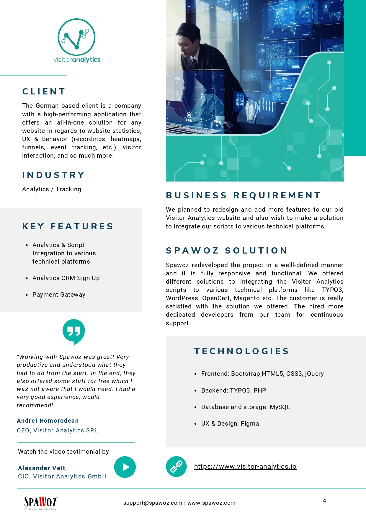 The client wanted the website to be built on a powerful Typo3 that provides all the required functionalities and is simple to use. Our client needs an Analytics tracking website containing a live tracker, demo page, and a plan booking feature. They required a live chat box and support feature also. The website also directs to an analytics tracking page where customers can track their websites.